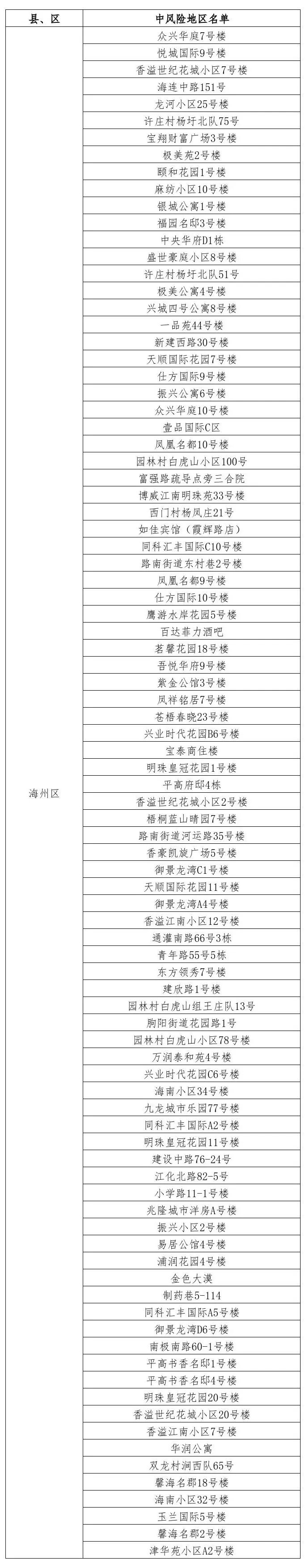 據(jù)國(guó)務(wù)院聯(lián)防聯(lián)控機(jī)制有關(guān)規(guī)定,經(jīng)市指揮部研究決定,自發(fā)布之日起,對(duì)我市部分區(qū)域疫情風(fēng)險(xiǎn)等級(jí)進(jìn)行調(diào)整:開(kāi)發(fā)區(qū)久和國(guó)際新城二期33號(hào)樓由中風(fēng)險(xiǎn)地區(qū)調(diào)整為低風(fēng)險(xiǎn)地區(qū)。其他地區(qū)風(fēng)險(xiǎn)等級(jí)不變。調(diào)整后全市現(xiàn)有90個(gè)中風(fēng)險(xiǎn)地區(qū)。 連云港市中風(fēng)險(xiǎn)地區(qū)(90個(gè))