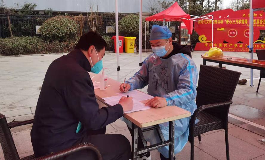 在該小區核酸檢測點,一名身穿防護服的男生也引起了大家的注意,在整齊的隊伍旁邊,他忙碌地來來去去,一會兒維持秩序,一會兒將行動不便的老年人引導到綠色通道前,忙得不亦樂乎。這位小伙子叫袁晨,是上元公司的一位預備黨員,當居民問到他累不累時,他笑了笑:“我是一名青年,那些醫護人員和社區工作者才辛苦。我覺得,穿上防護服的那一刻,我仿佛也成為了一名白衣天使,雖不及醫護人員那么偉大,但做著自己力所能及的事,為疫情防控貢獻一份力量,我發自內心的快樂,渾身也充滿力量?!?/span>