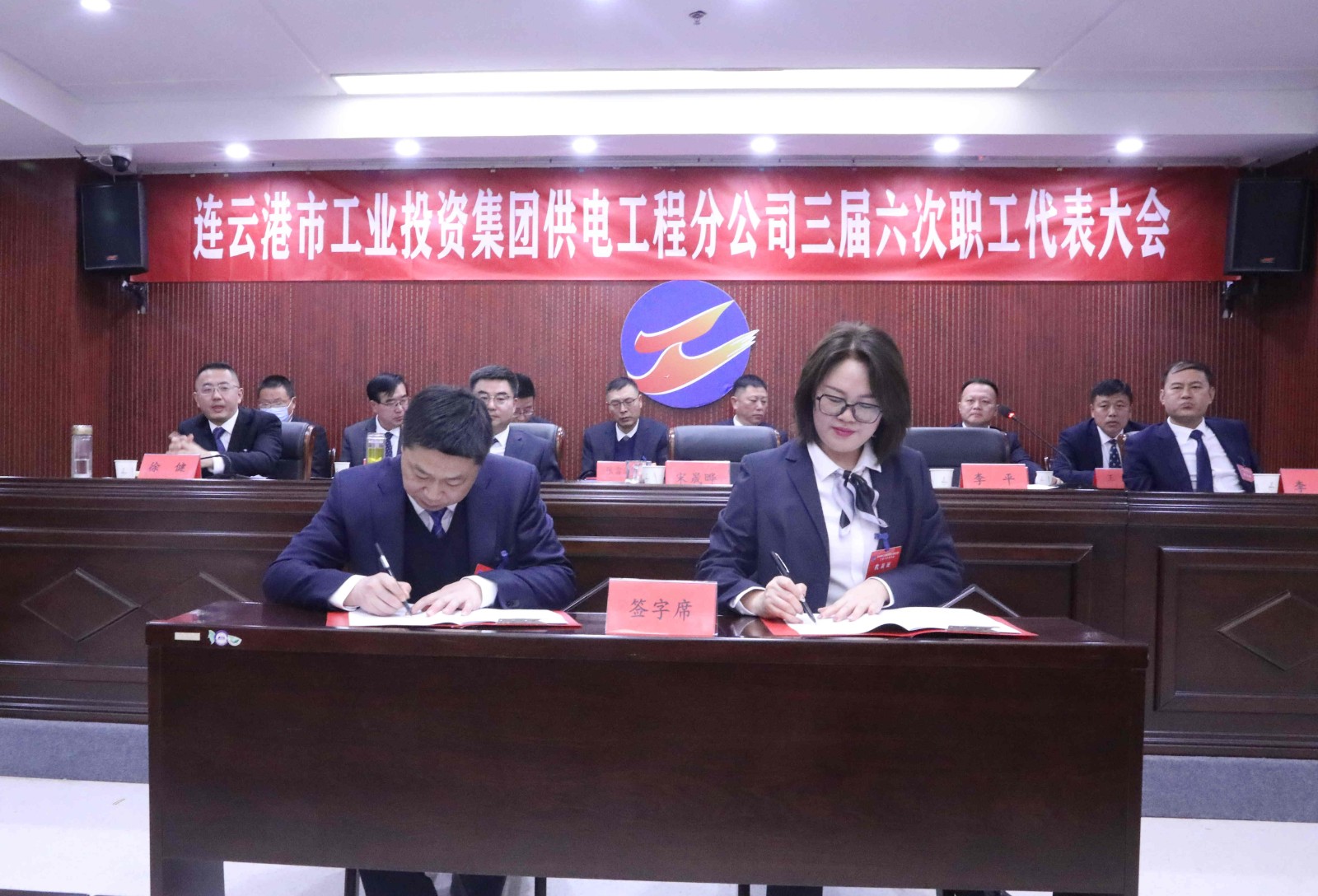 會上對2022年度先進(jìn)單位、個人進(jìn)行了表彰,臺北供電所、徐南供電所、灌西供電所、安全管理部等四家單位、部門作了表態(tài)發(fā)言并簽訂了《2023年度集體合同》《2023年度經(jīng)營目標(biāo)責(zé)任書》。