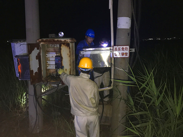 7月30日晚,臺南供電所員工在蒿西養殖區緊急處理由于過負荷導致的配電箱電表線路故障。入伏以來,連云港氣溫居高不下,電網負荷持續走高,7月30日晚21點,由于用電負荷突增,蒿西養殖區發生配電箱電表線路故障,接到報修電話后,該所值班工作人員迅速備件,冒著高溫、悶濕的條件下進行緊急搶修。圖為工作人員正在安裝配電箱電表接線。此次新招2名實習員工也參加了該項搶修任務。截止當晚11時蒿西養殖區及其周邊已送電成功。