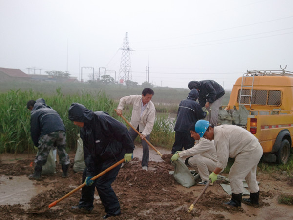 徐圩供電所接到防風防暴指令后,立即組織全所人員進入應急防汛狀態。
