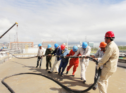 此項(xiàng)工程線路鋪設(shè)需經(jīng)過300多米地下頂管、200多米的空中橋架和多個電纜井。較之以往施工難度更大:一是高空作業(yè)多,施工進(jìn)度難以把握;二是人員負(fù)荷大,電纜需穿過多處交叉橋架,工程機(jī)械不能較好的發(fā)揮作用,大量的工作需要人力完成;三是天公不作美,從30日開始,陣雨雷雨不斷,現(xiàn)場施工人員的衣服也多次濕透。