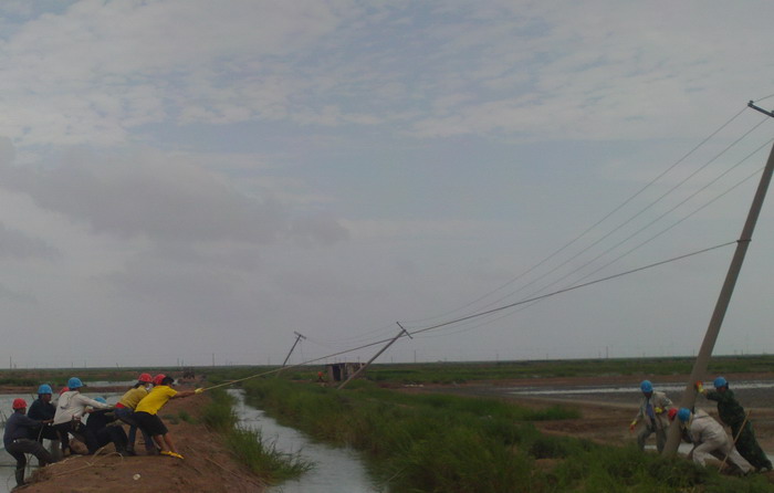 8月3日天剛亮,大家都顧不上休息,立即分片趕到受災現場巡視情況。東港工區洋井口8根高壓桿被刮倒,大瑞頭圩、二圩、新灘口和方南、嚴港等工區30多根低壓桿被刮歪,有的倒在了格堰上,情況十分危急。搶修人員立即作了停電應急處理,確保安全。