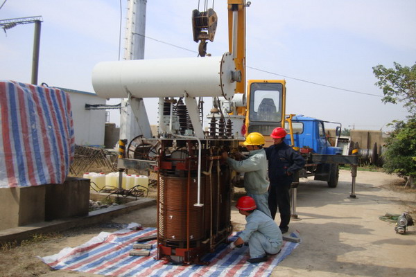 10月6日,臺北供電所抓住用電低峰,對兩臺3150千伏安和2500千伏安主變壓器進行養護維修,以確保節后高效、平衡、安全供電。(李吉成)